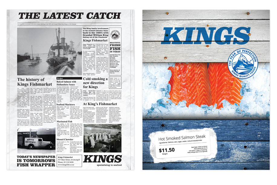 Kings Seafood asked us to design a pouch that would stand out on the shelf in the supermarkets. The irregular and differing shape of the package contents required a functional and flexible design that would frame the product as well as enhance the freshness. On the back of the packaging we created a mock up of a newspaper that told the story of the Kings brand.